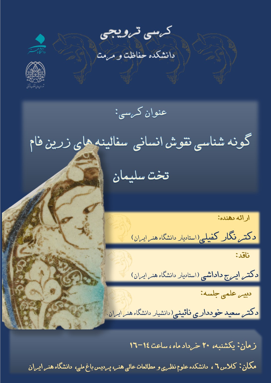 دانشکده حفاظت و مرمت برگزار می کند: کرسی ترویجی با موضوع: گونه شناسی نقوش انسانی سفالینه های زرین فام تخت سلیمان ۱۶ خرداد ۱۴۰۳ | ۱۰:۵۴ کد : ۶۲۶۹ در دانشکده چه میگدرد؟ ارسال به دیگران نام شما ایمیل شما ایمیل دریافتکننده ارسال انصراف تعداد بازدید:۵۱۹