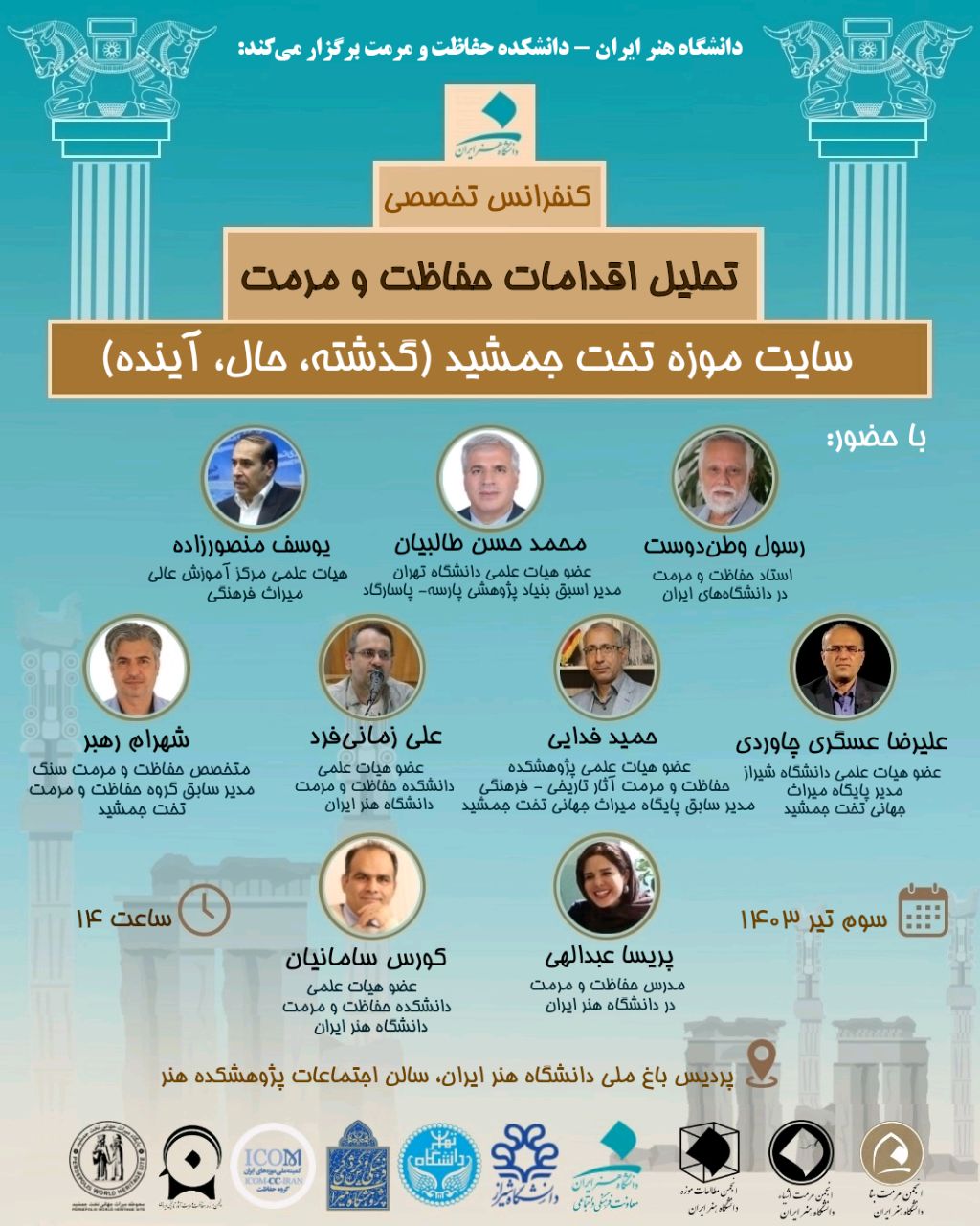 کنفرانس تخصصی تحلیل اقدامات حفاظت و مرمت سایت موزه تخت جمشید (گذشته، حال و آینده) با همکاری دانشکده حفاظت و مرمت - دانشگاه هنر ایران به همراه انجمن موزه، حفاظت و مرمت آثار تاریخی ایران، انجمن علمی - دانشجویی مطالعات موزه، مرمت اشیاء و مرمت بنا دانشگاه هنر ایران، دانشگاه شیراز، دانشگاه تهران، مجموعه میراث جهانی تخت جمشید و میراث فرهنگی، گردشگری و صنایع دستی با حضور اساتید حوزههای مرتبط روز یکشنبه 1403/۰۴/03 ساعت ۱۴ در سالن پژوهشکده هنر - پردیس باغ ملی دانشگاه هنر ایران، برگزار می گردد.