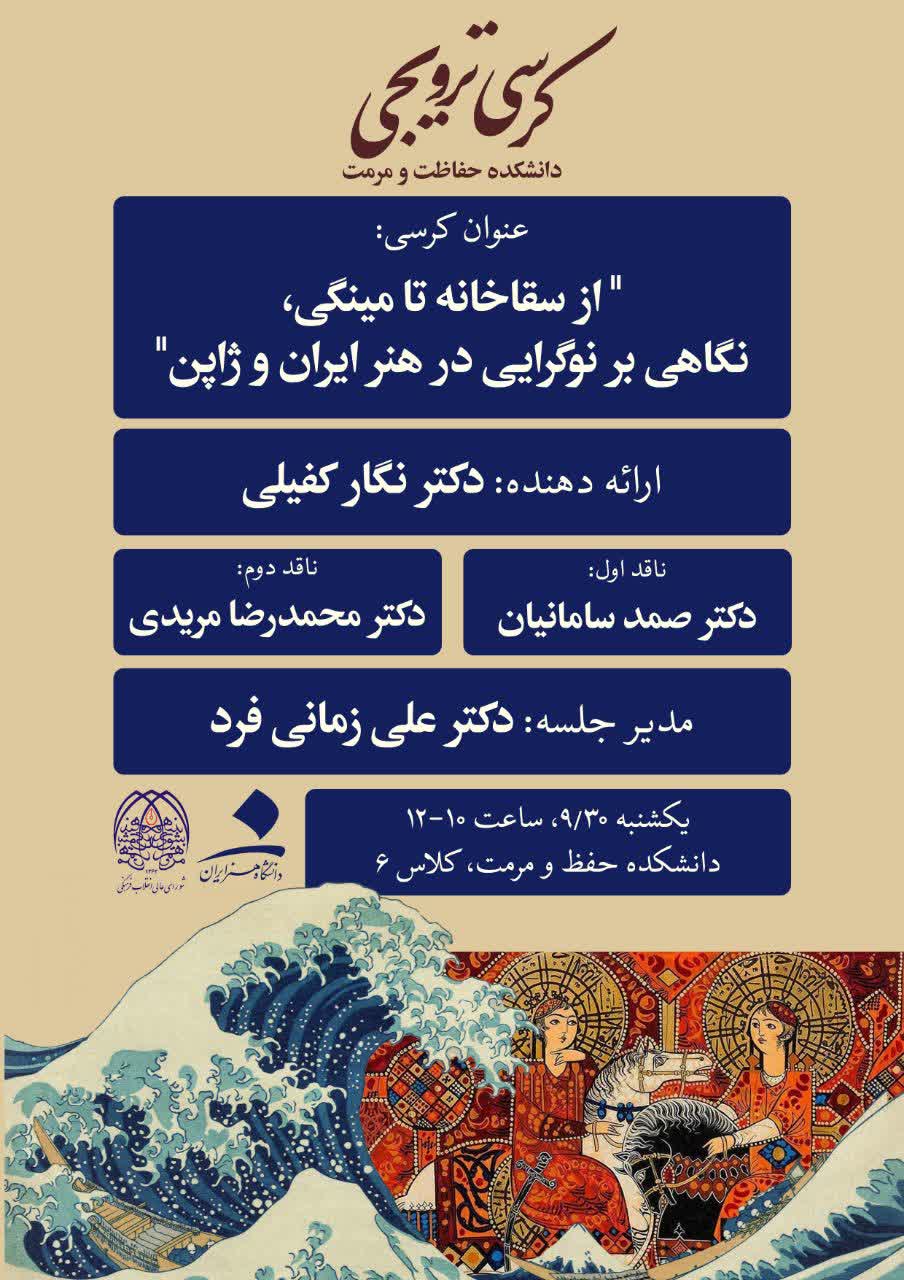 دانشکده حفاظت و مرمت برگزار می کند، کرسی ترویجی با عنوان: از سقاخانه تا مینگی، نگاهی بر نوگرایی در هنر ایران و ژاپن ۲۸ آذر ۱۴۰۴ | ۱۲:۲۳ کد : ۷۴۳۸ در دانشکده چه میگدرد؟ ارسال به دیگران نام شما ایمیل شما ایمیل دریافتکننده ارسال انصراف تعداد بازدید:۴۷